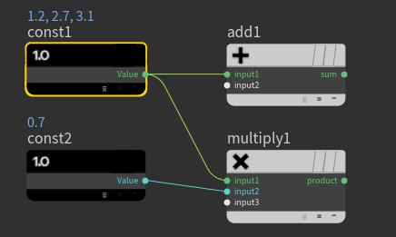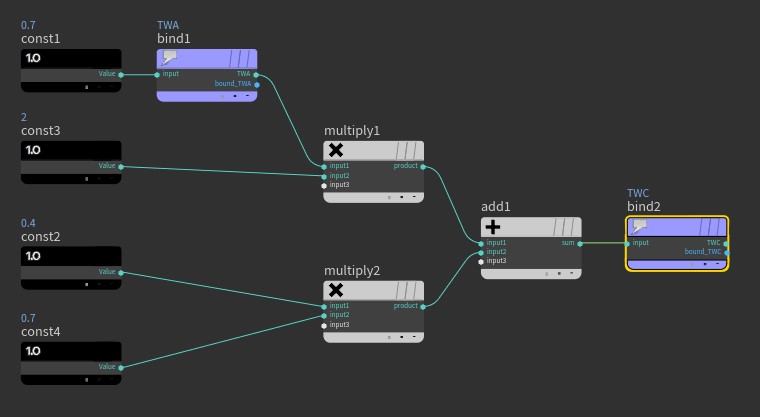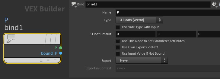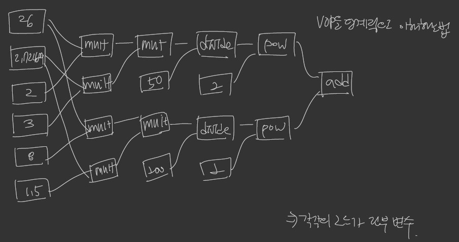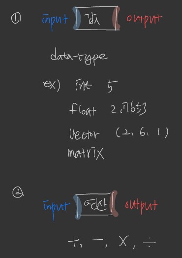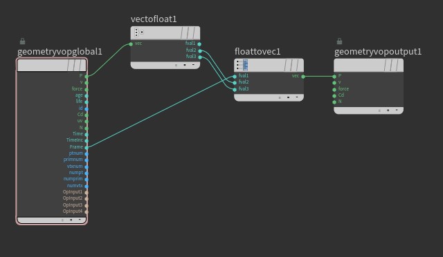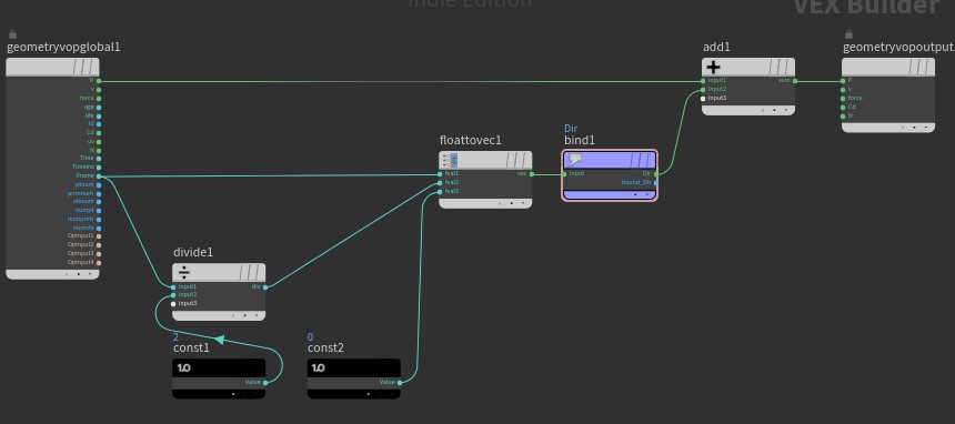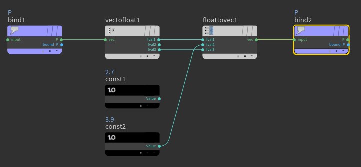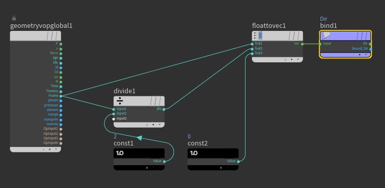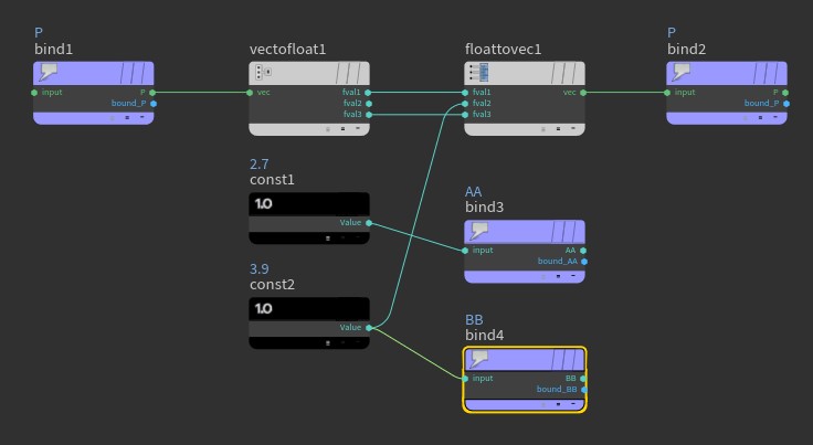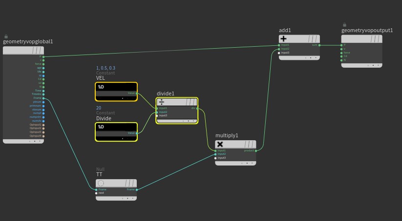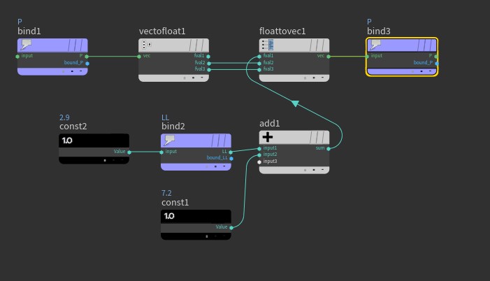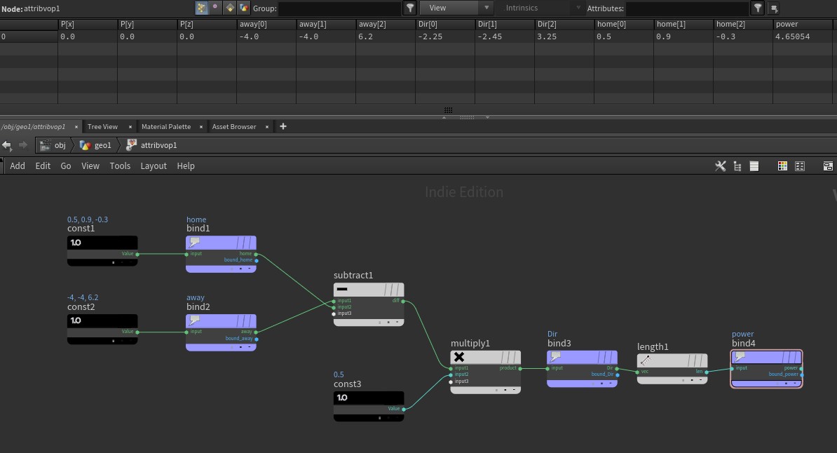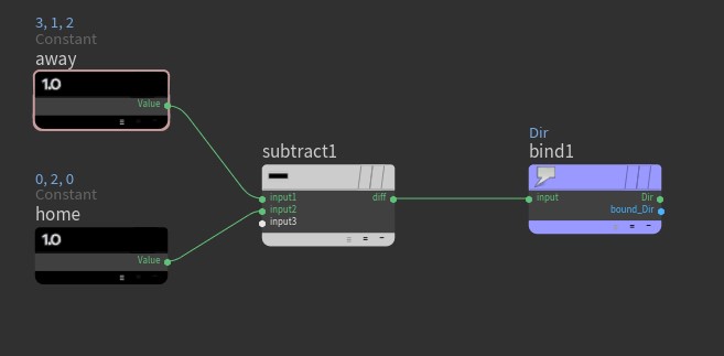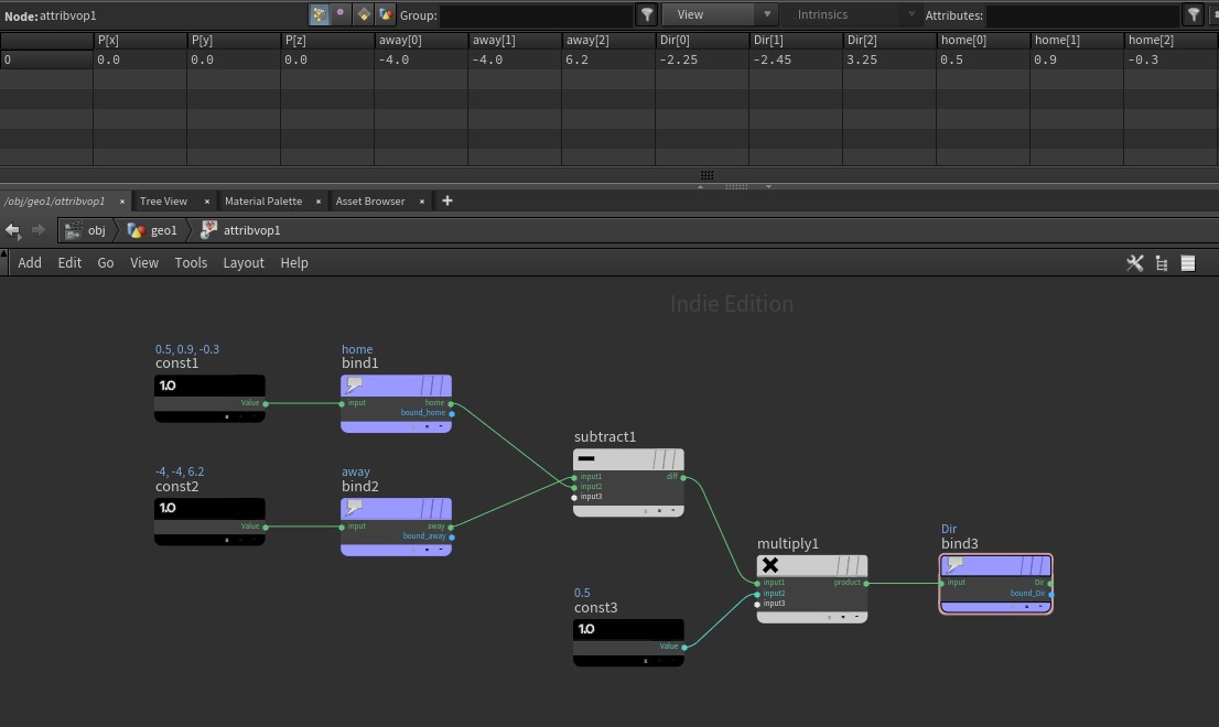 최초입문 6강 part 2 (2023. 1. 17)STUDY: TWA후디니 랭글러 2기 Beginner 2023. 1. 17. 22:26Attribute VOP, Attribute Wrangle 기본이해와 비교 VEX 후디니에서 수학을 알아야하는 이유: 램프 만들기 램프 만들기 아이디어, if A와 B가 같을 때 If A와 B가 다를 때, 램프 컨셉 다지기 램프 뼈대 만들기 램프 면 작업하기 FX와 IK에 대하여 과제: 램프 만들기 -좌표 값은 base와 target에만 입력 -target이 멀어질수록 head의 관심이 줄어든다. -target이 가까우면 일정 거리를 두고 비춘다. 6강 part 2 Attribute VOP Attribute와 변수의 공통점 - 공통점: VEX계산과 연산 과정에서 값을 저장하고 연산 중에 그 값을 다시 이용할 수 있다. - 차이점: Attribute는 결과에 저장되며 다음 노드에서도 다시 이용이 가능하지만, 변수는 현재 노드에서만 이용할 수 있다.  방법의 차이일 뿐, 결과는 똑같다 Attribute Wrangle: Math(VEX) style - 확정적 명령 - 변수가 고정되어 있다. Q. KK의 값을 구하시오. a = 26 b = 2.72489 AA = (2a * 3b) / 50 BB = (8a * 1.5b) / 200 KK = (AA)2 + (BB)2 with VEX: 복잡한 연산에서 더 큰 기능을 발휘한다. float a = 26; float b = 2.2489; float AA = (2a * 3b)/50; float BB = (8a * 1.5b)/200; f@KK = pow(AA, 2) + pow(BB, 2); VOP style - 유동적 명령 - 모든 노드가 변수로서 역할을 한다.   01 01횡으로 나열되는 VOP 값 - 노드는 VEX가 지원하는 data type의 정보를 가지고 있다면 그자체로 값의 기능을 한다.  input과 output이 있다 - add노드에 들어오는 정보의 순서는 중요하다. - 먼저 들어온 정보: 1번 input - 2번째 들어온 정보: 2번 input - add노드 = 1번 + 2번 - 연산의 앞순서에 있는 data type을 결과값이 따라가므로 연결되는 와이어의 순서는 매우 중요하다.  연산의 순서와 노드 input의 순서    012 012Wrangle ➡ 수식으로 표현 ➡ VOP VOP에서의 Attribute - type casting에 차이가 있다. - VOP에서 Attribute를 사용하기 위해 bind, bind export 노드를 활용한다. - Attribute로 만들고 싶은 노드에 연결   01 01VOP에서 Attibute 만들기 in HOUDINI - 인터페이스 레이아웃 수정하고 씬뷰와 네트워크 뷰에 링크 걸기: 1번  각 화면의 링크 고정 - Add 노드에 point 생성하고 Attribute VOP 연결, Geometry Spreadsheet에서 확인   01 01Attribute Wrangle과 Attribute VOP 파라미터 차이 (Run Over 옵션 중요) - Attribute VOP을 클릭해서 VEX Builder로 들어간다. - 들어갔을 때 있는 2개의 노드는 편의를 위해 미리 세팅된 노드는 연습을 위해 지우고 시작한다. 1. 작업을 위해 Attribute을 불러오는 법 2. 상수는 만드는 법 3. 연산자를 꺼내는 법 4. 값을 분해 했다가 뭉치는 법 5. 값을 Attribute로 출력하는 법 bind 노드 활용 - Attribute VOP 노드의 input으로 들어와 이용할 수 있는 Attribute이 있다면 그것을 사용한다. - Attribute VOP안에서 bind 노드 생성  binde 파라미터 - Name: 우리가 이용할 수 있는 Attribute가 있다면 그것을 이용하겠다. - 현재 존재하는 parm(parameter) Attribute는 Add의 info에서 확인할 수 없는 Attribute이다. - 우리가 알고 있는 Attribute인 P(position)을 넣고, [Type: 3Floats(vector)]  @P 세팅 완료 - 상수를 만들어주는 Constant 노드 생성 - [Constant Type]은 data type - [Constant Type: Vector(vector)]로 설정하고 임의의 값 입력 - 또다른 Constant 노드 생성 - [Constant Type: Float(float)]으로 설정하고 임의의 값 입력 - 연산자 노드: add, multiply - 연산자 노드를 생성하고 Constant와 연결하면 input 노드가 추가된다.  vector 값인 const1 + (const1 * float 값인 const2) - 변수이기 때문에 계산은 완료하였지만 Geometry Spreadsheet에서 확인할 수 없다. bind export 노드로 결과값 출력 - input이 없는 bind 노드와 다르게 bind export 노드는 input이 존재한다. - Attribute Name을 정해주면, Geometry Spreadsheet에 Attribute가 생긴 것을 확인할 수 있다. - Vector to Float: vector를 float으로 바꾸는 노드 - Float to Vector: float를 모아 vector로 바꾸는 노드   01 01원래 주어진 vector의 y값이무시되고 전부 0이 된다. 예제1 - bind 노드를 이용해 point attribute를 불러온다. - Name: P - Type: 3Floats (vector) - Constant 노드 생성하고 값 입력 (변수의 이름을 구체적으로 설정할 필요는 없다.) float = CC; CC = 2.7;  변수 CC float = DD; DD = 3.9;  변수 DD @P.y = DD;   01 01bind export로 결과값 출력 f@AA; @AA = 2.7; f@BB; @BB = 3.9; @P.y = @BB;   01 01@P.y를 Attribute VOP로 나타내기 예제2 - bind 노드 생성 - Name: P - Type: Vector (vector), 3Floats Vector (vector)와 차이 없다. float KK; f@LL;   01 01변수 KK와 Attribute LL KK = 7.2; @LL = 2.9;  변수 KK와 Attribute LL 값 @P.x = @LL + KK;    012 012@P.x의 Attirbute VOP 과정 예제3 f@TWA = 0.7; float TWB = 0.4;  변수 TWB와 Attribute TWA f@TWC = (@TWA * 2) + (TWB * 0.7);   01 01Attribute TWC의 Attribute VOP 과정 예제4 vector home; vector away; home = set(0, 2, 0); away = set(3, 1, 2);  vector 상수 v@Dir; @Dir = away – home;   01 01Attribute Dir의 Attribute VOP 처리 과정 예제5 v@home = set(0.5, 0.9, -0.3); v@away = set(-4, -4, 6.2);   01 01vector Attribute인 home과 away v@Dir = (@away - @home) * 0.5;  v@Dir의 Attribute VOP 처리 과정 f@power = length(@Dir);  Attribute VOP에서 length 노드를 사용하여 Attirbute power를 나타낸다 예제6 @P.x = @P.x + 1;  기본 제공 노드를 활용하여 @P값 추출 예제7 @P.x = @P.x + @Frame;  기본 제공 노드에 있는 @Frame 을 활용 예제8 v@Dir = set(@Frame, (@Frame / 2), 0);  그리고 연산 노드를 연결한다 @P = @P + @Dir;  기본 제공 노드로 export된 결과 값 예제9 vector VEL = set(
