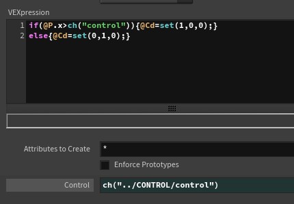 012@Cd의 시각화 - position x값의 조건(변수)을 attribute wrangle에서 파라미터로 만든다.